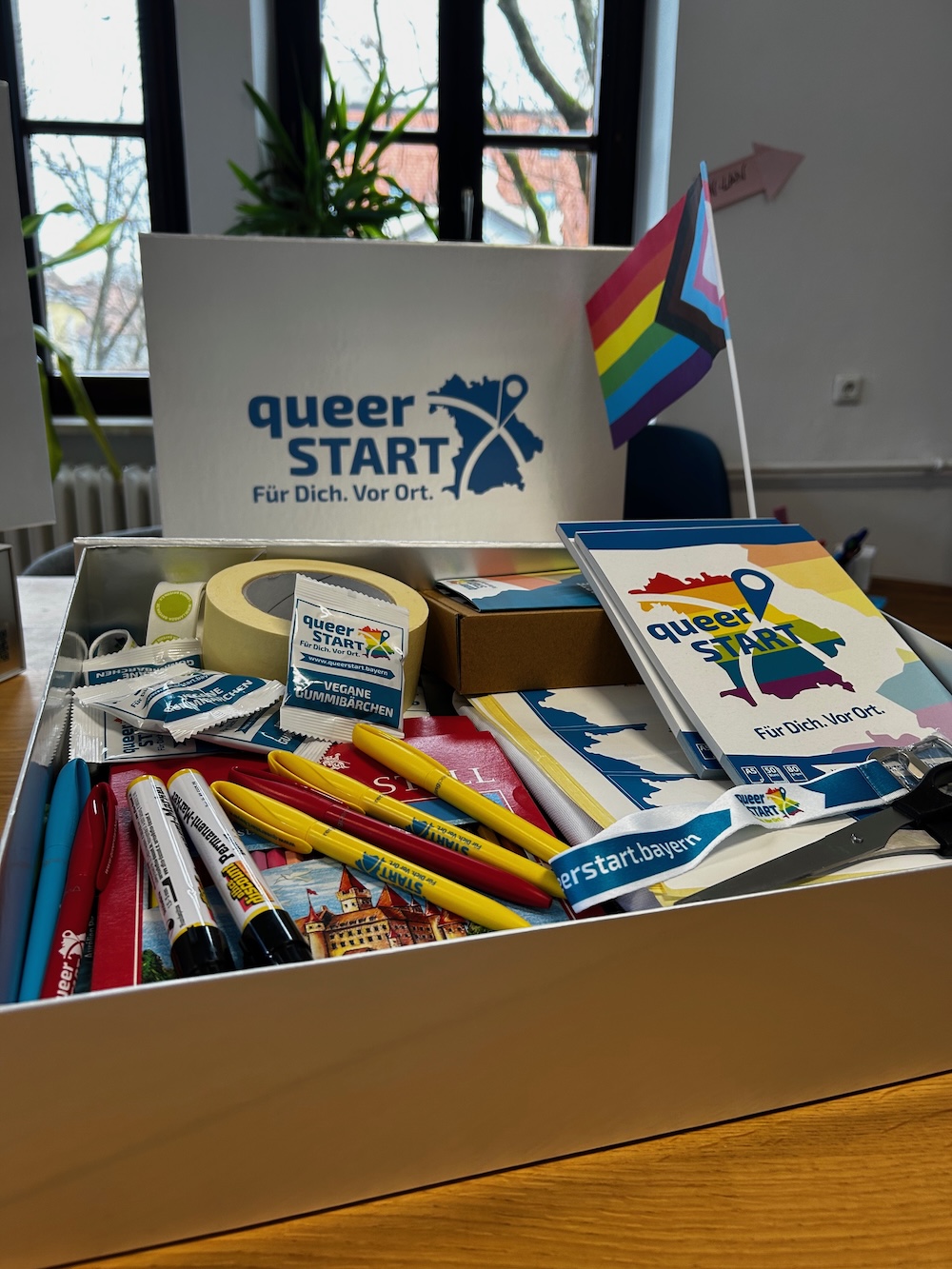 Die QueerStart-Box bietet Materialien, die den Aufbau und die Gestaltung von queeren Jugendtreffen erleichtern. Neben Informations- und Arbeitsmaterialien für Gruppenstunden enthält sie Kooperationsspiele wie TopTen oder Materialien, die beim Aufbau regelmäßiger Treffen unterstützen. Dazu zählt beispielsweise Moderationswerkzeug, Impulse für Warmup-Situationen, ein Klemmbrett, Pronomensticker oder Namensschilder. Insgesamt stehen 50 Boxen zur Verfügung, die nächsten Übergabe durch das QueerStart-Team sind an die Jugendgruppen VIDA Landsberg und die Equaliteens in Weiden geplant. Ziel ist es, junge Menschen zu ermutigen, eigene queere Räume zu schaffen und langfristige Strukturen für Austausch und gegenseitige Unterstützung aufzubauen.