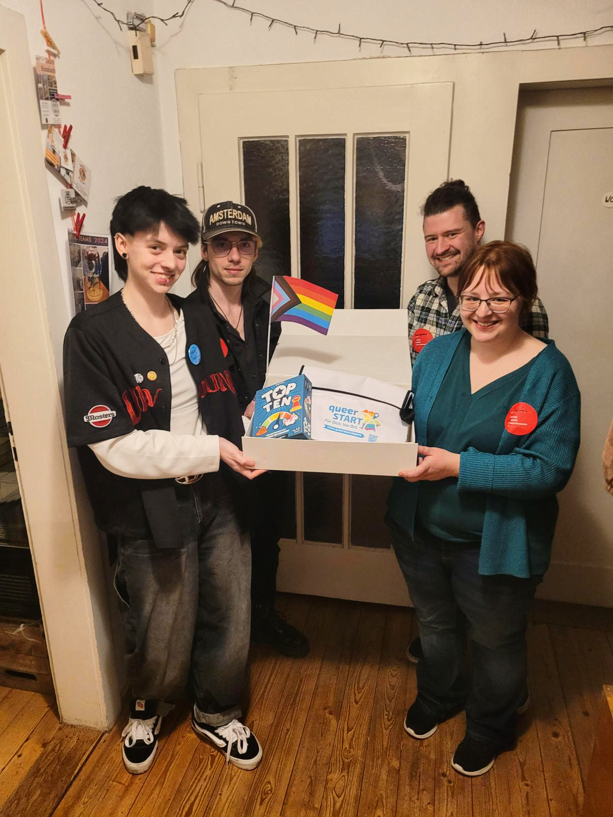 Gemeinsam mit Jonathan Wehrstein, ehrenamtlichem Vorstandsmitglied von Lambda Bayern, überreichte Jasmin Klein nun die erste QueerStart-Box an die Gruppe. „Mit der neuen QueerStart-Box sind unsere Jugendgruppen gut ausgestattet, um regelmäßig tolle Angebote für Jugendliche anzubieten, die einen Safe Space suchen“, sagt Wehrstein. Auch Hannah Sperandio, ehrenamtliche Jugendleiterin im Jugendtreff, freut sich über den Rückenwind: „In den letzten Monaten haben wir viel erreicht, wir freuen uns über die Unterstützung durch das Projekt und die Box.“
